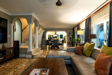 Accessed via a short staircase, the main living area welcomes guests through a large wooden door onto a spacious balcony featuring a 12-seater dining table and stylish seating. The formal lounge boasts a massive 90-inch TV perfect for cozy movie nights. This open-plan space includes a formal dining area, a fully fitted kitchen with a scullery, and a convenient pantry. A second dining area leads to the opposite side of the balcony and onto a piazza-style terrace with two outdoor dining areas—perfect for poolside lunches.