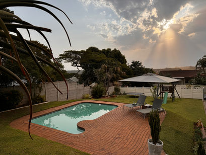 The heart of this property is its exceptional outdoor area. A large swimming pool, jungle gym, and trampoline ensure hours of fun for children, while the entertainment space is ideal for braais, family meals, and relaxed evenings together. As the sun sets, guests can take in breathtaking views that make this home truly special.